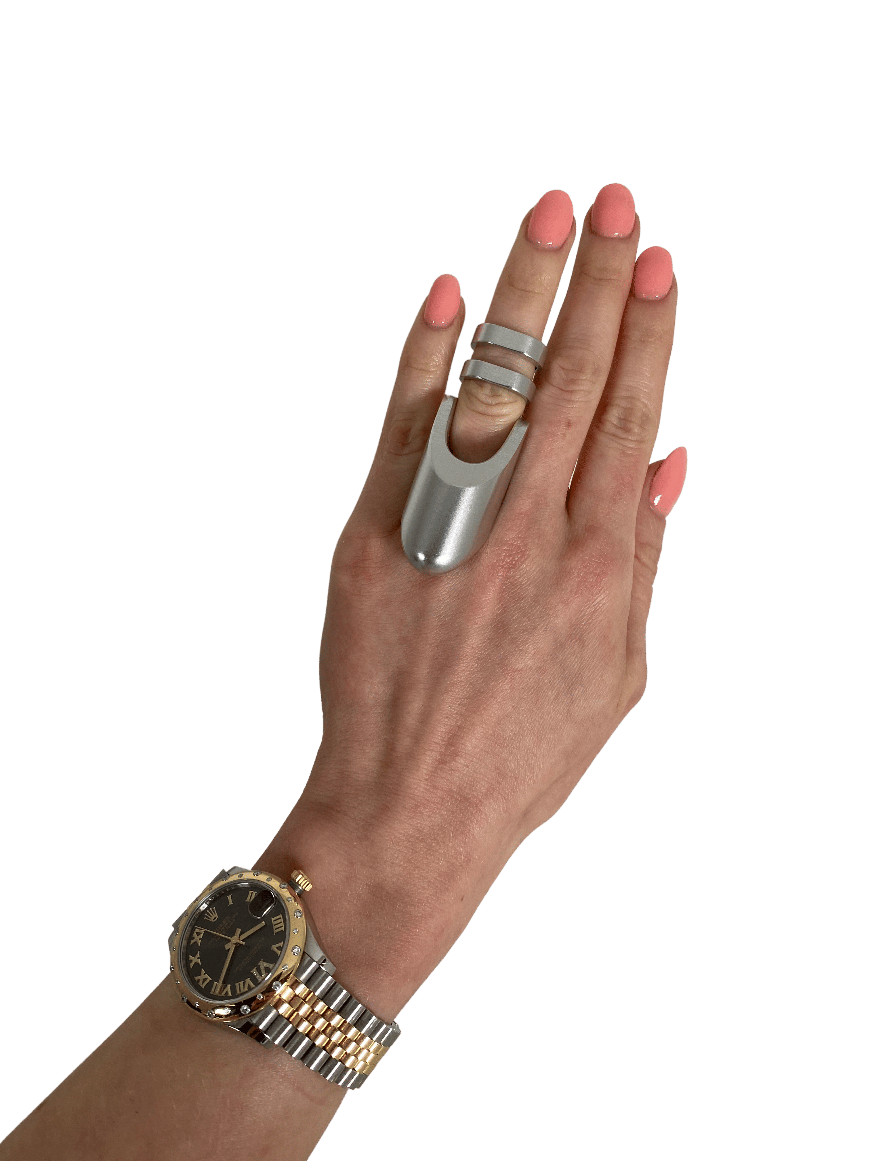Enjoy unique personalization to an exclusive and discreet wearable vibrator with three modern colors; the jewel of your hand the smallest sex toy to ever soak your sheets. Made of radiant aluminum alloy; a body-safe and highly seductive material; will you choose the elegant and enticing dark gray anodized; the shimmering and sparkling silver anodized; or the attractive and alluring nickel glossy finish as your choice in vibrator ring color?